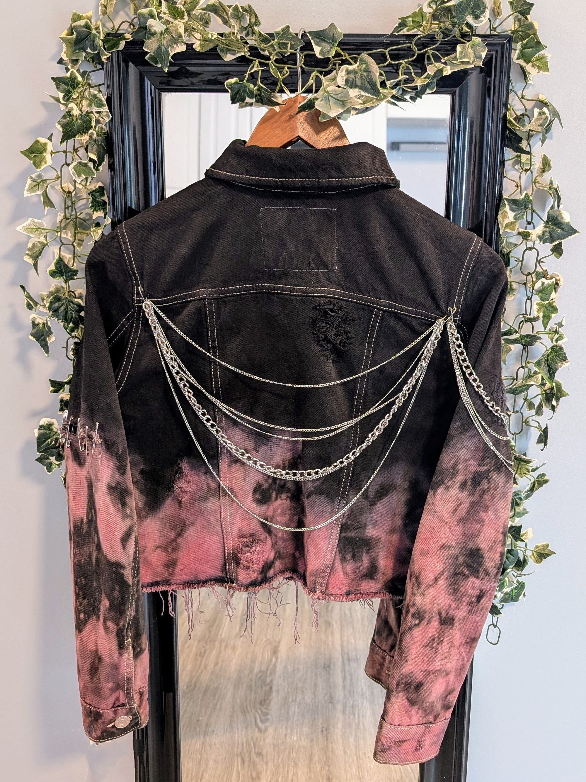 This isn’t just a jacket—it’s a full vibe. Starting as a basic black denim piece, this women’s small jacket has been totally reworked into a cropped, punk-inspired masterpiece. Featuring hand-dyed pink + black tie-dye, raw distressed edges, chain hardware on the sleeve, and custom destruction detailing, it’s made to stand out.